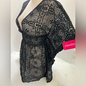 This black lace swim coverup features a deep V-neckline and wide kimono-style sleeves, offering a chic and breezy look for beach days. The intricate lace pattern adds a touch of elegance, while the empire waistline ensures a flattering fit.