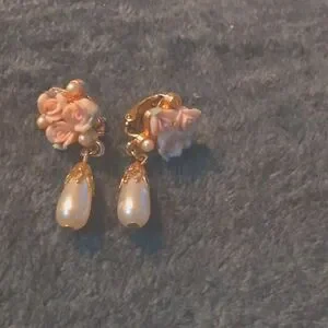 lovely mini faux pearl and porcelain pink rose clip dangle earrings gold tone perfect. 1"