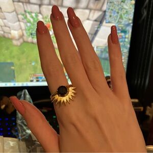 Elegant gold ring featuring a striking black sunburst design. Perfect for adding a touch of sophistication to any outfit. Stored in plastic containers for protection. Seems size 7/8