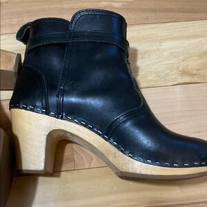 Step out in style with these sleek black ankle boots. No brand tag but looks like Swedish Hasbeens. Tag made in Italy. Leather in good preloved condition shows signs of wear with some markings see pictures. Wooden sole shows lots of markings but this doesn’t stop them from being super stylish and ready for adventure.