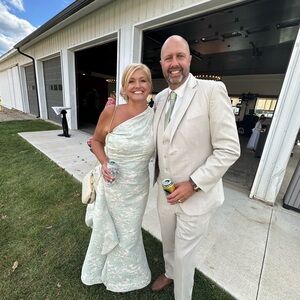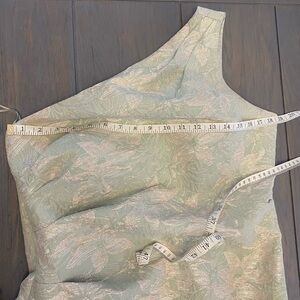 Elegant one-shoulder gown in a subtle green shade. Perfect for formal events. I wore this once to my son’s wedding. I had it altered in length I am 5’6” and wore 2 in heels. I had it altered a little in the chest area see the pictures for the measurements. For reference I am 5’6” and I am 160 pounds. It is fraying slightly a little discoloration at the very bottom hem see pictures, but it is not noticeable at all.