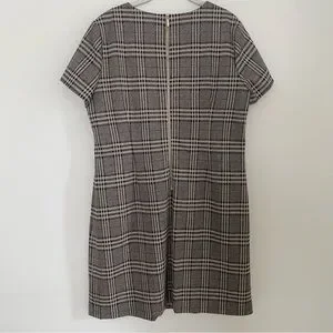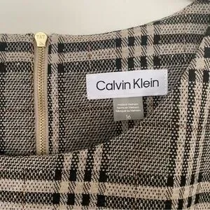 This Calvin Klein mini dress showcases a stylish A-line silhouette in a classic black and tan color scheme. Featuring short sleeves and a crew neck, it is perfect for both work and casual occasions. The dress's elegant design ensures a flattering fit, making it a versatile addition to any wardrobe.