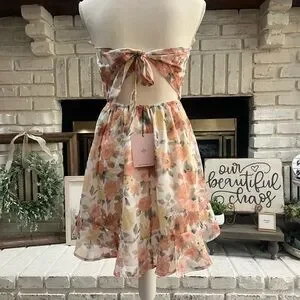 Perfect for spring, soft peaches and greens, with shimmery embroidery. Stretchy smocked bust, ties in back. Fully lined, new with tags. In perfect condition, just ended up being too big on me.