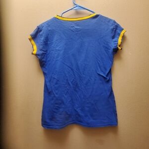 This is a pre-owned junior's/ Girls Nike size small short sleeve blue and gold Milwaukee Brewers top. This top is in good pre-own condition