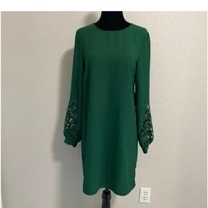 Elegant green dress by H&M featuring delicate lace sleeves. Perfect for any occasion.