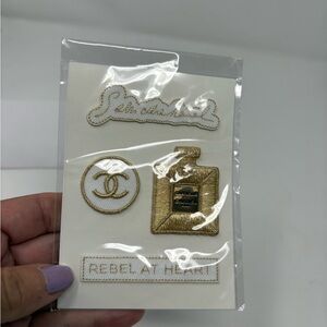 Enhance your style with these elegant Chanel embroidered patches in gold and white. Perfect for adding a touch of luxury to any accessory.