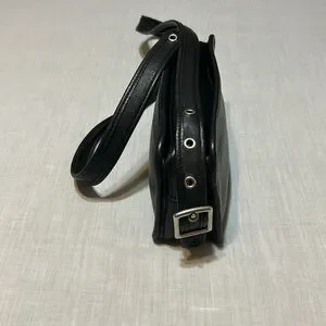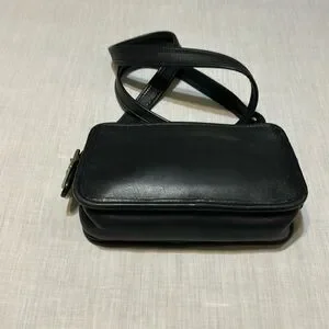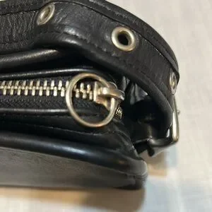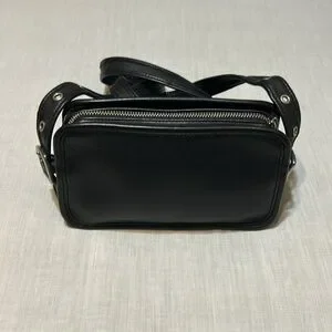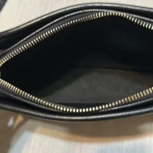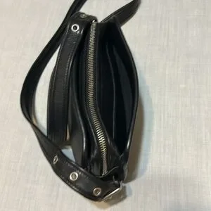 Pre-Owned; Good condition; Sleek and stylish black leather crossbody bag. Perfect for everyday use with a modern design. Missing pull on top zipper as shown in picture.