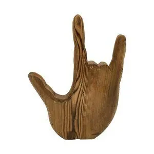 Wonderful wooden hand carved into the ASL sign for "I love you" w/wood grain that gorgeously accentuates the design. Appears to be handmade by machine, not hand carved as it is smooth w/details at joints & around fingers. EUC w/minor wear (see pics & below). Will stand on its own but not super steady, so currently best used as a tabletop piece. 2 holes in back for hanging (last pic) but no hardware when found allowing the option to choose what works best for you. Unique piece perfect for or as a gift to a special deaf or hard of hearing person, or a new way to express your feelings to any loved one.