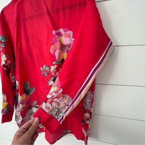 Red silk blouse with floral print and side stripes