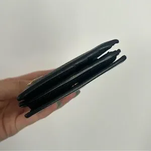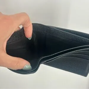 Men’s leather wallet in excellent pre-owned condition. Minor signs of wear. Features 8 card slots, 2 bill compartments, and 1 snap-button coin pocket. Very clean. Button closure works perfectly.
