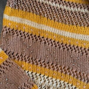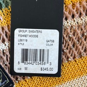 Features embellished gold beads throughout the fishnet pattern and there engraved goldtone hardware at the end of the hoodies’s strings. The material is soft, comfortable, and So unique. Perfect for layering.
