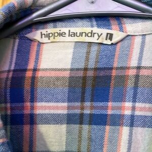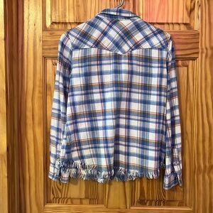Western style plaid snap-up shirt in blue and pink and white. Snaps on sleeves and pockets with mother of pearl finish. Features front pockets and frayed hem. Soft flannel; 100% cotton. Measures 18 inches pit to pit; 12 inches from pit to side hem. 17 inch arm from pit to hem. It doesn’t say “petite “ but fits like petite.