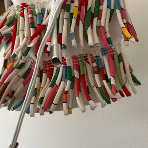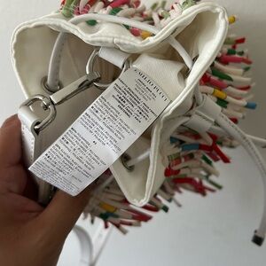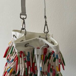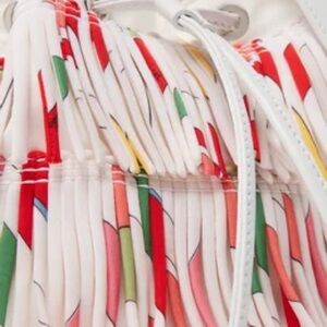 Elevate your style with this chic white and red fringe bag. Perfect for any occasion, this bag adds a touch of flair to your outfit.