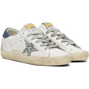 Iconic handcrafted Golden Goose Deluxe Brand low top star sneakers. SSENSE exclusive limited edition style. Paneled buffed white leather upper. Yellow textile logo patch at tongue. Blue canvas heel tab with logo stamp. Diagonal stitching detail and silver glitter star with metallic "GGDB Private Edt" lettering on the outer side. Lined in leather and terrycloth. Treaded black rubber sole and trademark insole with a slight wedge that lengthens legs. Brand new with box, dust bag and Golden Goose passport. Gorgeous rare colorway, just never got around to wearing these and I need to downsize! Retail $625