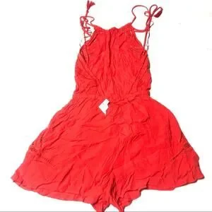 This airy romper is perfect for summer fun with its exposed back fastened with slender ties and insets of open stitching. Fit: this style fits true to size. - Crew neck - Sleeveless - Ties behind neck; ties behind back - Woven construction - Unlined - Approx. 3" inseam, 30.5" length (size S) - Imported