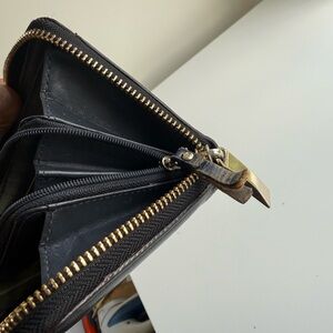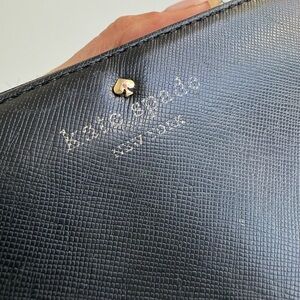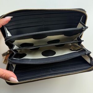 Sleek black wallet by Kate Spade. Features a zip-around closure.
