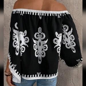 Stylish off-shoulder top featuring a chic black and white design. Perfect for casual outings or a night out. Elevate your wardrobe with this versatile piece.