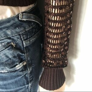 LOVELY CROCHET SEQUIENCE SHRUG. RICH BROWN WITH A FLAIRE OF SASS. GREAT FROM THE OFFICE TO DATE NIGHT