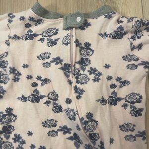 Adorable kids one piece with a charming floral design. Soft pink fabric with gray accents and navy flowers.