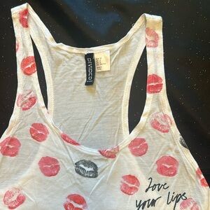 Worn maybe 2x. Do you love LOVE? Then this tank is for you. A beautiful free flowing white w/kisses in 💋pink, 💋red & 💋black tank top. A bell 🔔 bottom. So very soft, stretchy & cool for Summer.