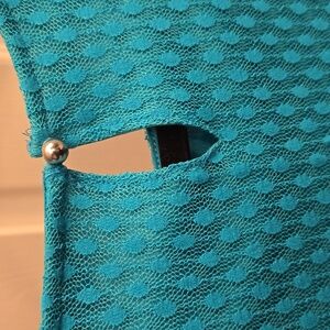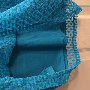 Elegant blue lace top with built in slip, short sleeves. Perfect for any occasion. petite small. please see photos for measurements.