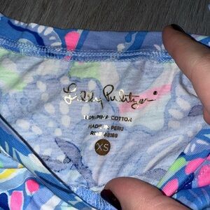 Vibrant dress. Brand Lilly Pulitzer with a bold pattern. Features shades of blue, pink, and green. Perfect for a lively look.