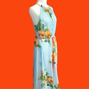 Summer maxi. Fully lined. Blue and white pinstripes with orange floral design and ties. This is so pretty!