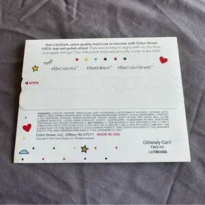 New in package Color Street nail strips. Retired “Glitterally Can’t” is a sparkling pink glitter. This set is petite (made for smaller nails). There is a little bit of discoloration on the back of the package.