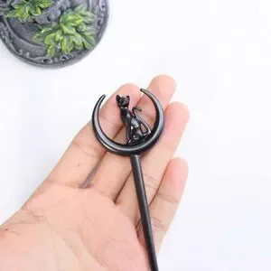 Amazing, Adorable Black Cat Hair Pin/ Hair Accessory, Black Color and beautiful Crescent Moon. Engraved Black Cay Design in Front and in back to add that extra detail. Perfect for anyones dark wardrobe!🖤