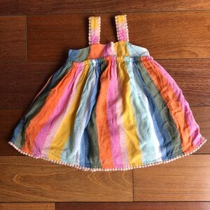 Vibrant Tahari sundress with multicolor stripes. Features pom-pom trim and shoulder straps. Has white lining. Two button design in back of dress. Size 24 months. Dress is 94% rayon and 6% linen. Lining is 100% cotton. This dress was never worn. In great condition. No visible defects or stains. Stored in non smoking, pet free home.