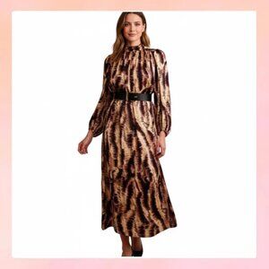 Elevate your wardrobe with this sophisticated Banana Republic animal-print midi dress. Perfect for any occasion, this dress features a chic high neckline, puffed long sleeves, and a flattering belted waist for a timeless silhouette. Designed in a medium petite size, it ensures a tailored and elegant fit. This piece is brand new with tags (NWT) and ready to become a staple in your collection!