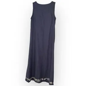 Beautiful embroidered linen dress from PureJill is summer perfection. This maxi dress features a modest V neckline, sleeveless silhouette, and loose-fitting sheath style. There are shaping darts in the bust to give some soft shaping. Ecru-colored embroidery is along the front and continues along the hemline. There is a slit in the front at the hem. This dress is in like new condition, with no flaws. Perfect for any warm weather occasion. 100% linen