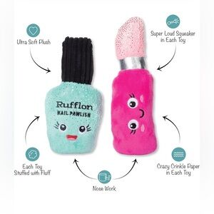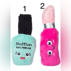 Cute plush toys shaped like nail polish and lipstick. Features mint green and pink colors with adorable faces.