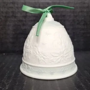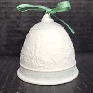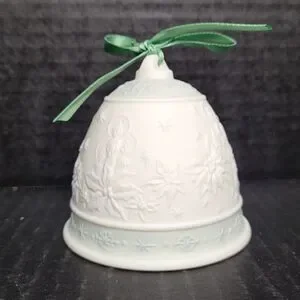 Elegant Lladro Christmas bell ornament from 1992. Features intricate detailing in white and blue. Campanita Navidad 92