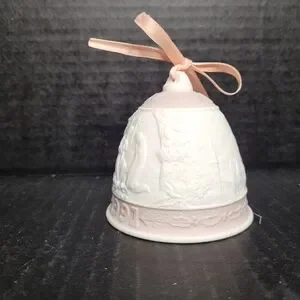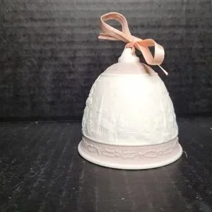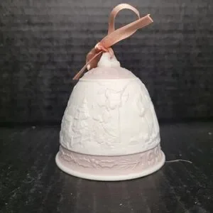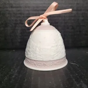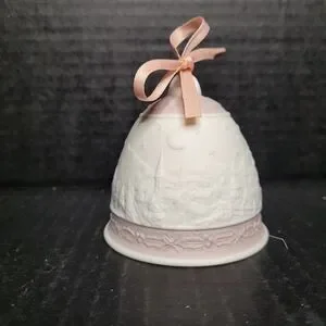 Elegant 1991 Lladro Christmas bell featuring a pink and white design. Perfect for holiday decor. Campanita Navidad 1.991 Christmas Bell #5803
