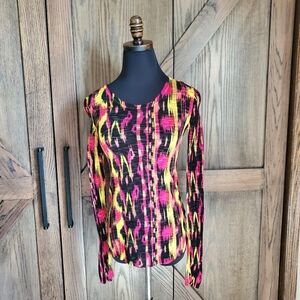 Vibrant Missoni sweater with a striking pattern. Features crew neck design. Perfect for adding color to your wardrobe. size xs. missing materials tag feels like a cotton wool blend.