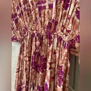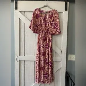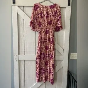 Elegant floral maxi dress featuring vibrant pink and purple hues. Perfect for any occasion.