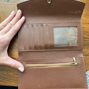 Elegant wallet in a stylish brown monogram design. Perfect for adding a touch of luxury to your everyday essentials. Trifold style. Some flaws and wear.