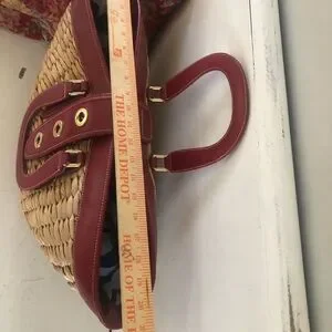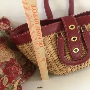 This elegant tote bag showcases a stunning woven design in tan, complemented by striking red accents. The sturdy handles and gold-toned hardware add a touch of sophistication, making it perfect for both casual outings and stylish events.