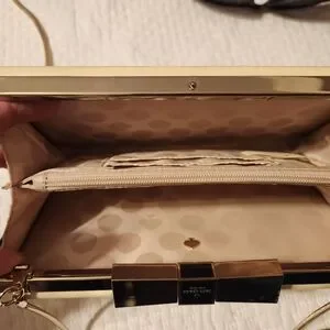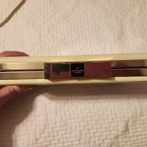 Elegant cream clutch featuring bold black text. Ideal for special occasions. From the Kate Spade 2013 novelty collection.