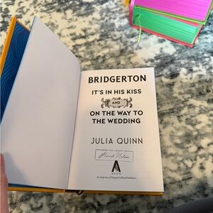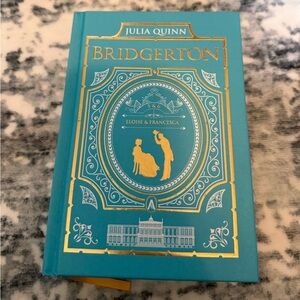 Bridgerton book set of 4. Each book contains 2 Bridgerton books in 1. Sprayed edges and ribbon bookmark on each. Each book has personal library stamp as shown in last photo. These have never been read and are in like new condition! Smoke free home. Willing to entertain reasonable offers.
