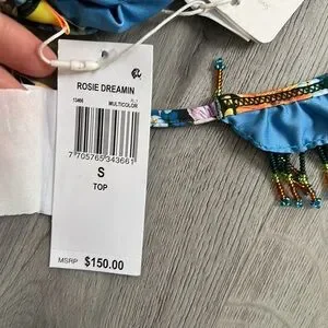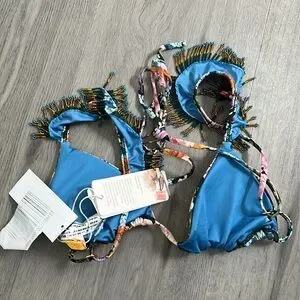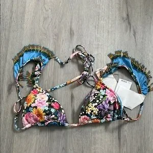 Flirty beaded fringe and tassels adorn this fun floral bikini from Agua Bendita, giving an island vibe to a classic two-piece silhouette. Bonus: the bottom is reversible