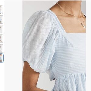 Elegant light blue dress with puff sleeves, perfect for any occasion. Enjoy a comfortable fit with a stylish design.