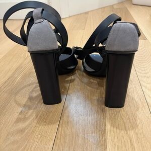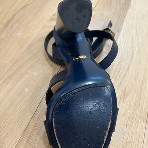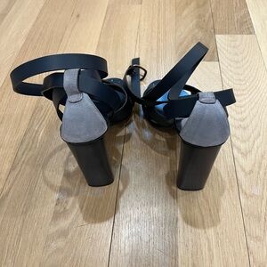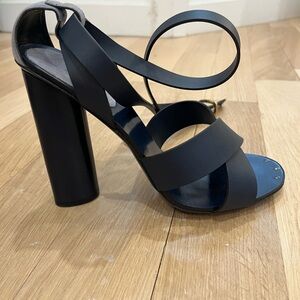 Authentic, gently used Gucci heels. Only worn a few times! Navy and gray heels with gold buckles. Leather straps wrap twice around handles. Made in Italy. Comfortable and fabulous!
