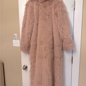 Stay warm and stylish with this luxurious pink faux fur coat. Perfect for adding a touch of elegance to any outfit.