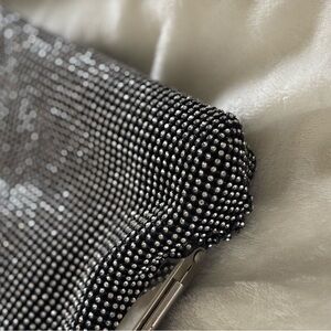 This stunning clutch features a dazzling black sequin body complemented by a sleek silver metal frame and detachable chain strap. Its versatile design allows it to be carried as a chic handheld clutch or a stylish shoulder bag, making it perfect for formal events or glamorous nights out.