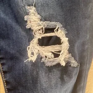 These blue skinny jeans feature a stylish distressed design with deliberate rips with jean underneath (not bare) coverage and fraying, offering a trendy, vintage look. Inseam 25.5” and tapered leg ensure a sleek silhouette, making them a versatile addition to any wardrobe.