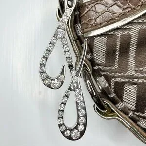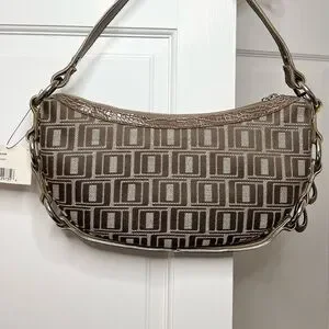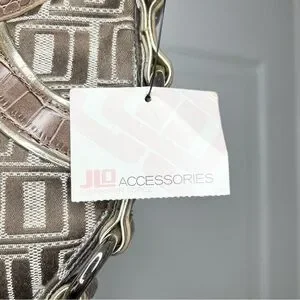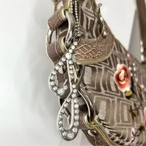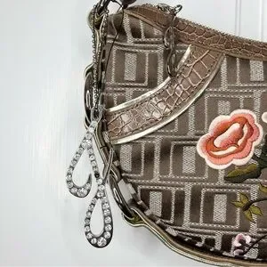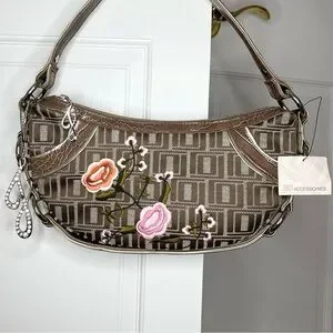 This stylish shoulder bag from Jennifer Lopez features a unique crescent shape and a woven pattern that adds texture and depth. The bag is adorned with charming floral embellishments in pink and brown, making it a standout accessory for any occasion. Its single shoulder strap ensures comfortable wear, while the metallic hardware adds a touch of elegance.