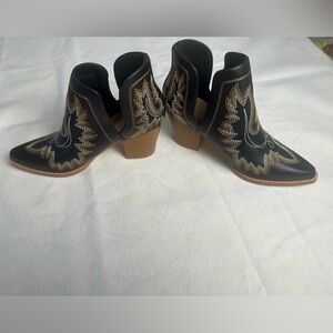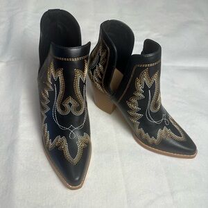 Step out in style with these chic black and gold embroidered western ankle boots. Perfect for adding a touch of elegance to any outfit.