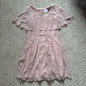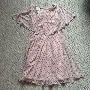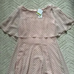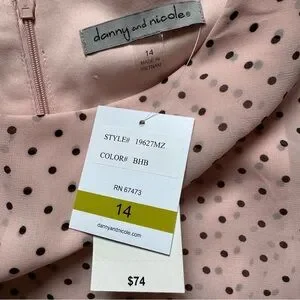 This Danny and Nicole dress is New with Tags. It’s a beautiful pale pink with small black polka dots. There’s a more fitted pink lining with a sheer overlay and a hidden zipper in the back. I’m 5’6 and it hits me right at the knee.